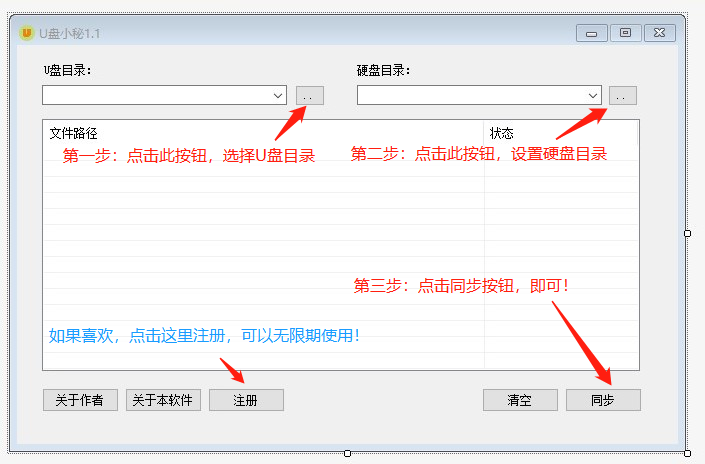平时在使用时,只要设置好U盘和电脑中自己经常使用的两个目录即可。不管自己在哪里编辑过这两个目录中的文档,在有时间时,插上U盘,打开本软件,点击同步,就可以让这两个目录中的文件保存最新的版本。